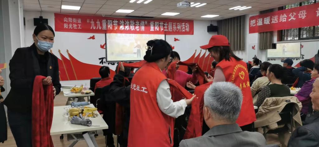九九重阳节,浓浓敬老情。10月14日是我国传统的重阳佳节,为庆祝重阳节的到来,弘扬中华民族爱老敬老的传统美德,公司志愿者一行8人到向阳街道甘棠社区参加重阳节敬老庆祝活动。在社区,志愿者们和社区工作人员一起为参加活动的老人们赠送寿字(寓意增寿),祝愿老人健康长寿,并发放纪念品,老人们神采奕奕,喜笑颜开,现场洋溢着浓浓的暖意。