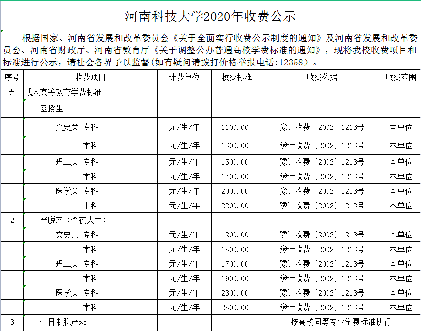 河南科技大学2020年收费公示。