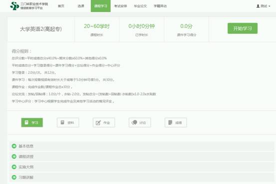 学员点击课程进入对应课程的学习页面,页面正文第一行显示当前学习课程的基本信息和学员目前的学习情况,点击开始学